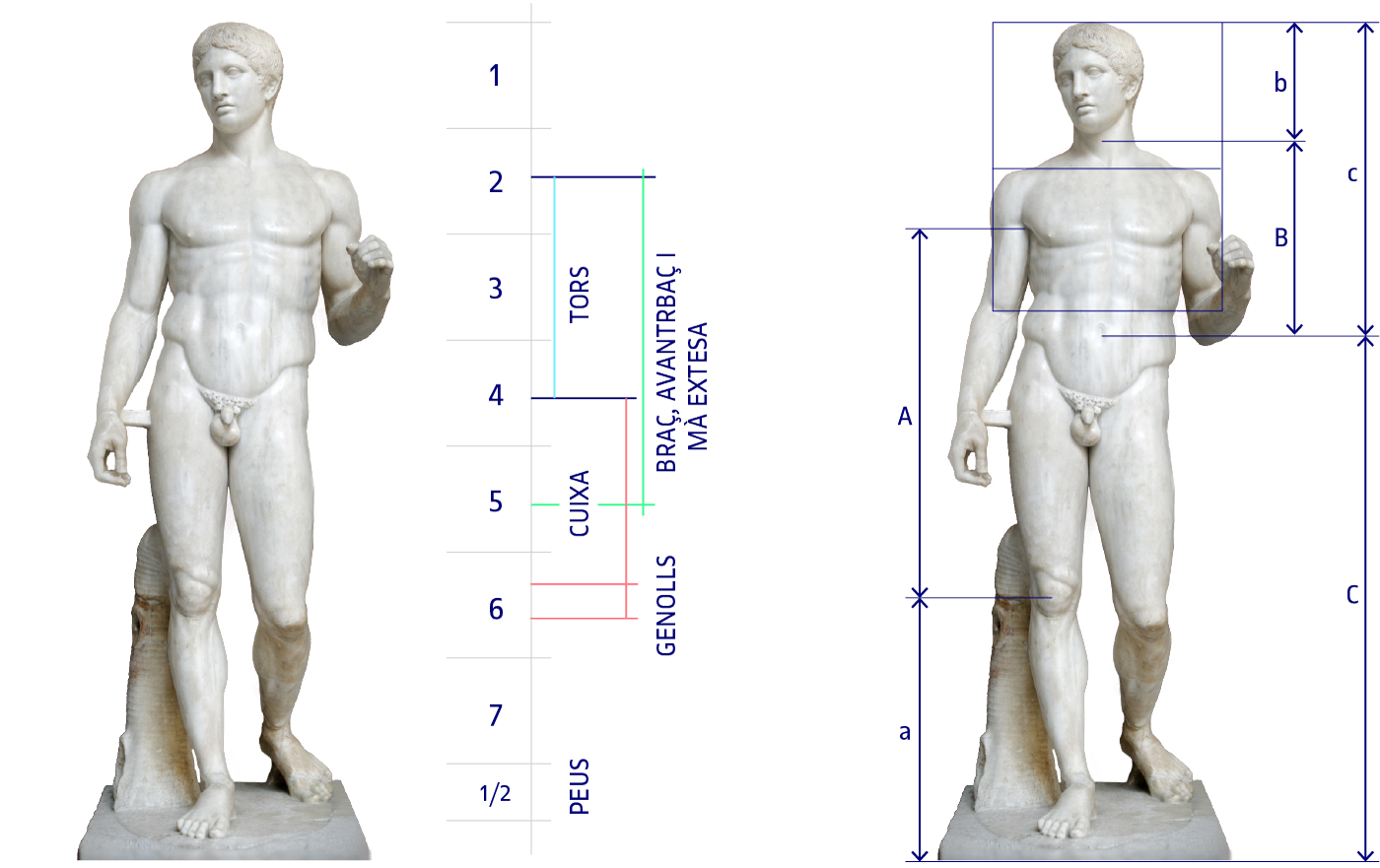 Un dels models o pautes conegudes a l’antiguitat, el cànon de Policlet aplicat a l’escultura, ha arribat fins als nostres dies. Canon és un terme grec que deriva de la paraula canya, fent referència a la vara que s’utilitzava com a regla o unitat de mesura. Policlet va redactar al segle V a. C. un tractat d’escultura que va titular Kanon. En el text s’establia un sistema de relacions proporcionals al cos humà. Utilitzant els principis de simetria, equilibri i disposició, va definir unes relacions harmòniques del cos humà que va estructurar a partir de la mesura del cap. Un cos humà ben proporcionat havia de tenir una alçada de set mides del cap. Amb aquests principis va relacionar les diferents parts del cos harmònicament, tant entre elles com amb tot el conjunt. El cànon va néixer com una necessitat per proporcionar un sistema representatiu que ajudés els artistes –escultors principalment– a crear figures segons l’ideal de bellesa clàssic.