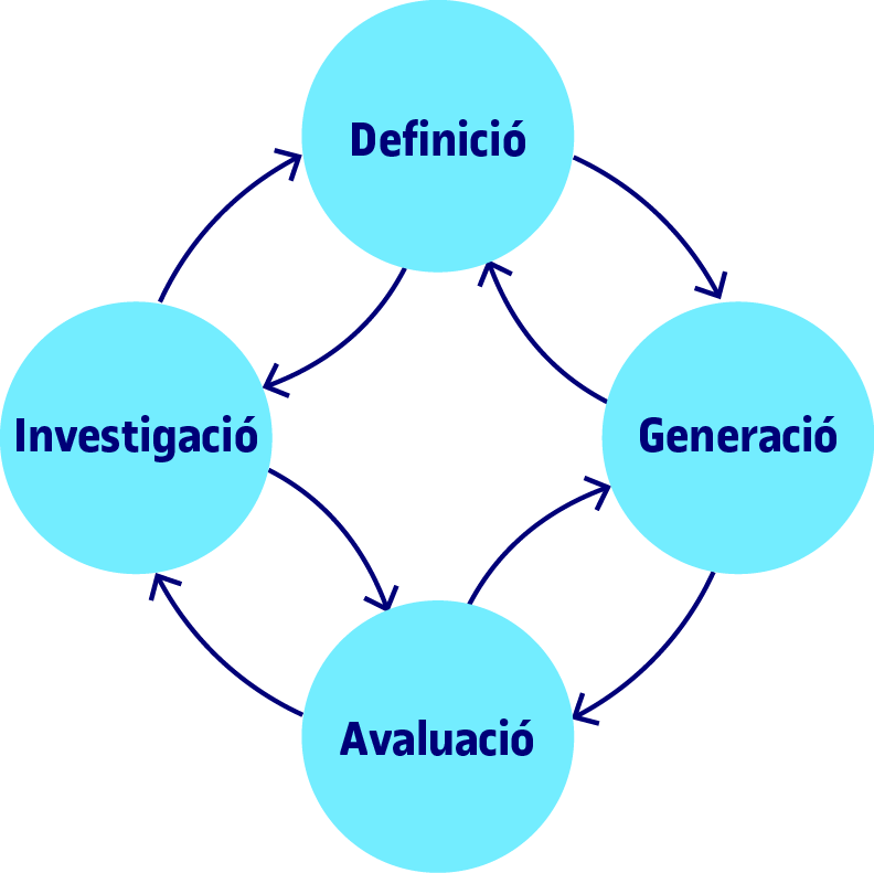 Així, en un procés de disseny centrat en les persones començarem amb les etapes d’investigació i definició que normalment treballem de manera iterativa entre elles.